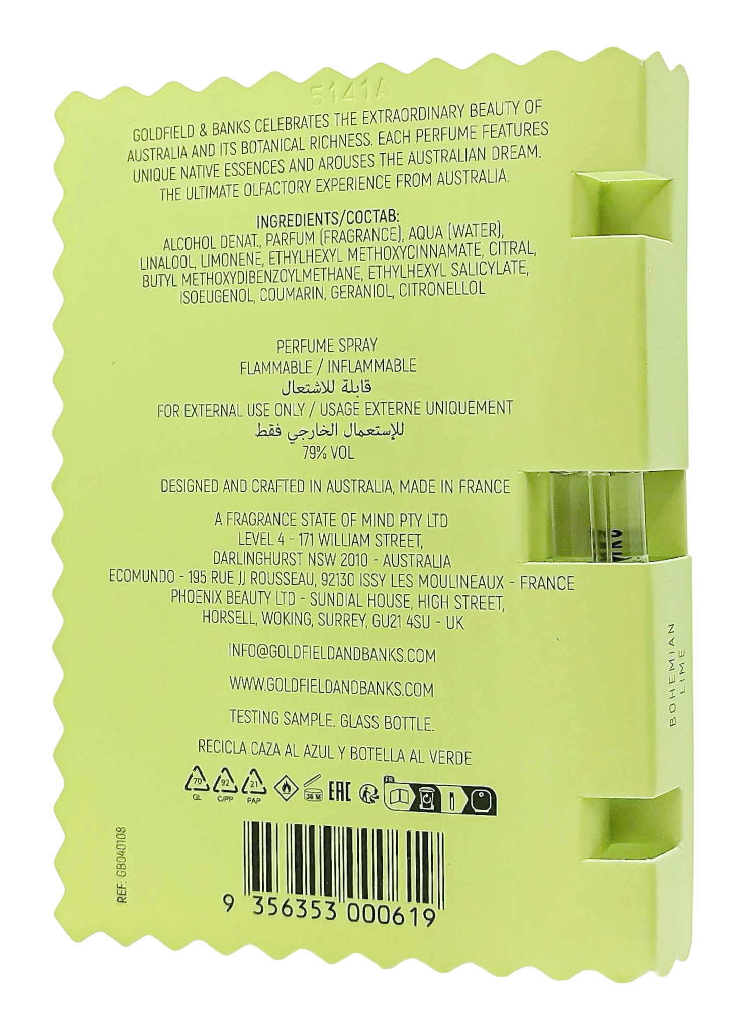 Goldfield & Banks Bohemian Lime Parfum to uniseksowa kompozycja inspirowana australijskim wybrzeżem, łącząca soczyste nuty limonki kawiorowej z aromatyczną kolendrą i subtelnymi akordami drzewnymi. Zapach emanuje świeżością i naturalną energią, otulając skórę elegancką, cytrusowo-drzewną aurą. Idealny na dzień i cieplejsze pory roku, podkreśla swobodny styl oraz nowoczesną, pewną siebie osobowość.